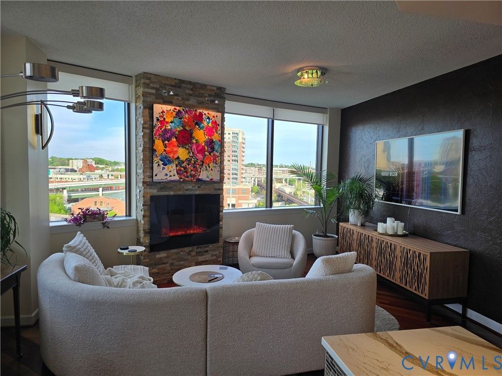 Welcome home to your renovated modern urban escape between the canal and river! Unit 815 has 2 BR, 2 Baths, 2 parking spaces and 2 storage units (one is double height). This unit has been delightfully updated with high end fixtures, wood floors and modern appliances, and a gorgeous feature stone fireplace and MannKidwell automatic blinds. But why cover the views of the downtown skyline, Church Hill and down the James River? Enjoy your kitchen updated with full peninsula, marble counters, solid wood cabinets, convection stove and oven, microwave and dishwasher. Principal BR has views downriver and walk in closet, and its ensuite bath has lovely tiled shower and counter, double designer sinks and a coveted extra large closet. Second BR has gorgeous solid wood built in desk and cabinets for dream home office, with space for bed or pull out sofa, and its own ensuite bath. New oversized stacked washer and dryer in large storage closet. Professional lighting throughout to display your artwork. Outdoor balcony to take in those amazing city views! Common amenities include secure covered parking, common room and kitchen available for use and updated workout and exercise facilities. First public offering since new. $539,000.