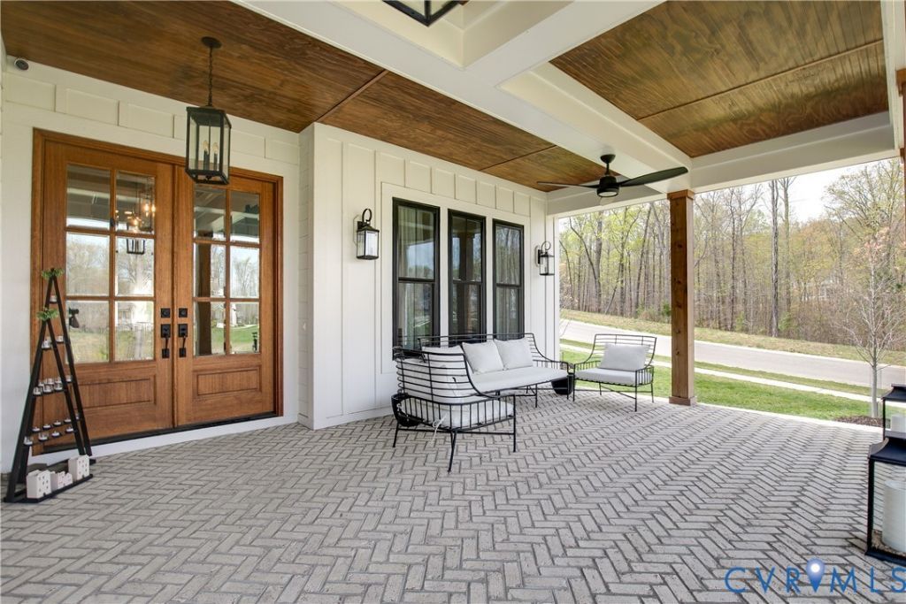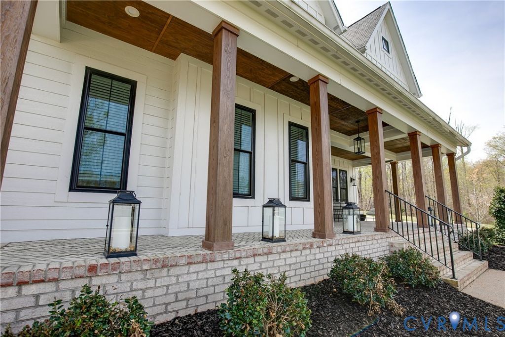 This stunning custom home by Biringer Builders, in the beautiful community of Tarrington, blends craftsmanship with elevated modern design. The exterior showcases classic farmhouse elements with gabled rooflines and board and batten accents, while the covered front porch features a unique herringbone brick floor, creating a warm first impression. Inside, 10-foot ceilings define the main level, while wide plank, engineered white oak flooring and oversized plantation shutters throughout the main and second levels add to the luxurious feel of the home. Just off the foyer, a private study is wrapped in custom picture-frame wainscoting with double barn doors. The butler's pantry with refrigerated drawers and a walk-in pantry connects seamlessly to the chef's kitchen, featuring a full-height tile backsplash, Sub-Zero refrigerator, Wolf gas range with stainless hood, dual dishwashers, quartz countertops, and an oversized island with seating and designer lighting. The dining area showcases a custom coffered ceiling with bold geometric trim detail and statement chandelier. The family room centers around a floor-to-ceiling brick gas fireplace with raised hearth and flows into a three-season room with Brazilian hardwood flooring. Upstairs, 9-foot ceilings continue throughout, along with a versatile loft. The primary suite features a coffered ceiling with designer millwork and a spa-like ensuite with a tiled shower and an expansive walk-in closet with direct laundry access. Secondary bedrooms offer generous closet space and access to beautifully appointed baths. The third level provides flexible living space with a bedroom and full bath. Outdoor living includes a paver patio with a fire pit. Additional highlights include an extra-deep two-car garage with built-ins and a 50-year roof. Enjoy Tarrington's premier amenities, including a clubhouse, resort-style pool, fitness center, walking trails, playgrounds, and a scenic riverfront park with James River access.